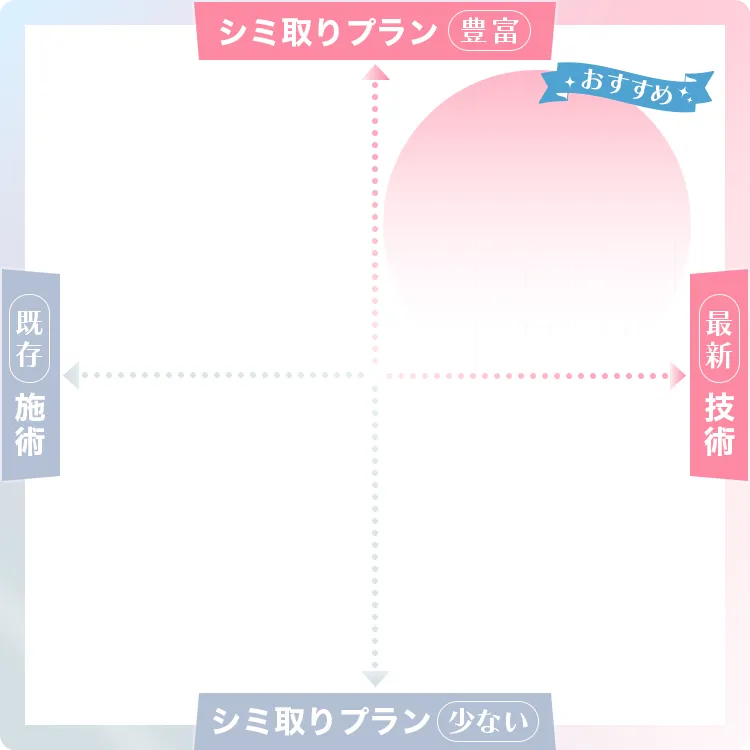 - シミ取り放題顔 シミ取り放題手の甲 - 54,780円〜 ※要相談 - その他プラン1 その他プラン2単発プラン - 1mmあたり