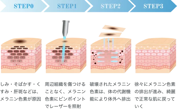 ピコシュアはメラニン色素を熱ではなく「衝撃波」で粉砕するため、周囲の皮膚への熱ダメージが極限まで抑えられています。